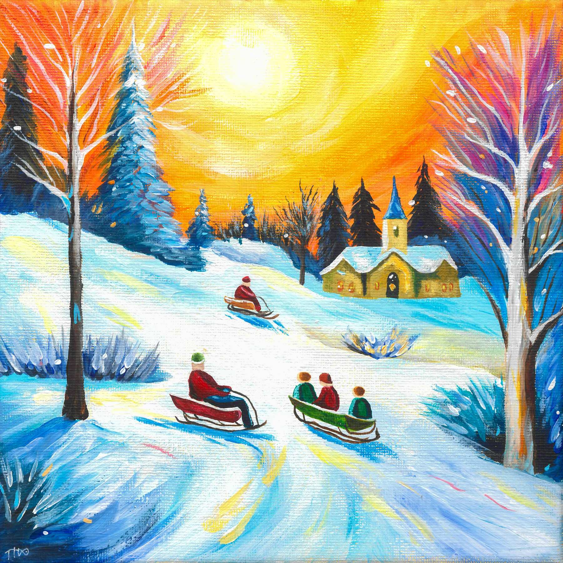 The Christmas card of my original painting 'A Snowy Winter's Sunset'