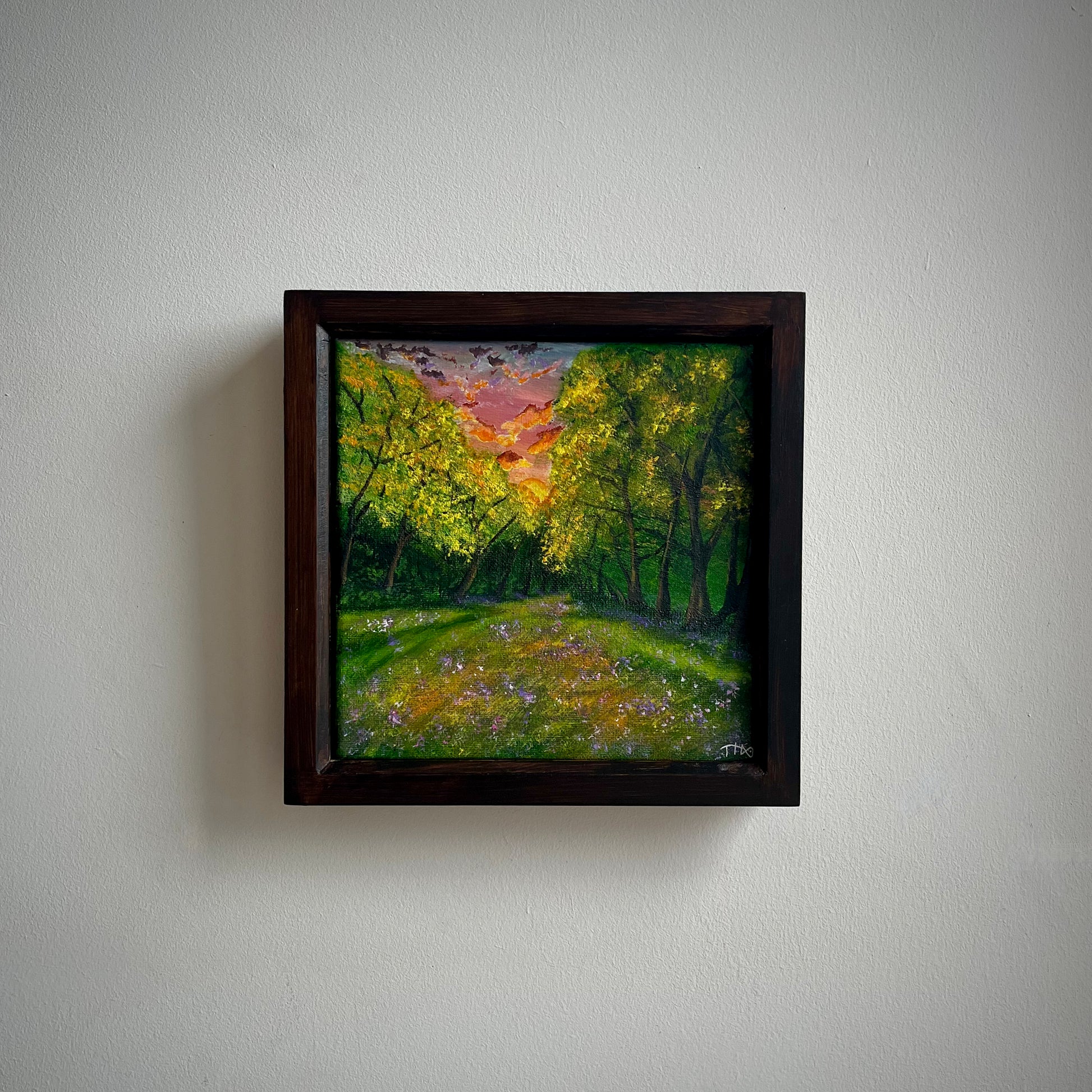 A fiery woodland sunset depicting a colourful and lively meadow in Clearbrook, South Devon, England. You can find this place running along the River Meavy.